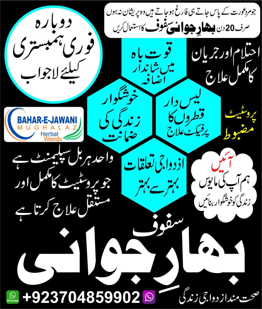 Bahar-e-Jawani Safoof is more than just a supplement — it’s a symbol of hope, power, and rejuvenation. Carefully formulated with time-tested herbs, our product supports men’s performance, stamina, and mental clarity.